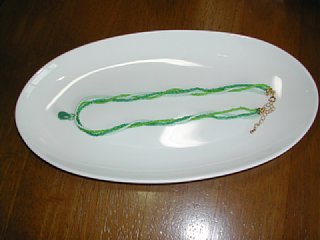 ビ−ズショップのご主人が「今一番人気」と勧めてくれた、しずく型のアベンチュリンをトップに、グリ−ン系の丸小ビ−ズで作ったチェ−ンを三連にし、ちょっとねじってみました。