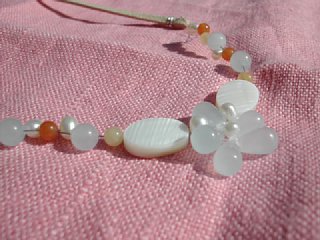 出来上がったネックレスとブレスレットを見て次女が「私も こういうのほしい」というので、同じようにワイヤー2本にお花の 形のビーズなどを通し、革ヒモをつけました。大喜びで早速 身に付けてくれています。 |