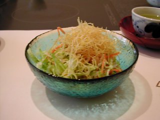 | 豆腐のサラダ。上にのっかっているパリパリしたものがすごくおいしかったので店のひとに尋ねたら、「からいも(さつまいも)です」と教えてくださいました。からいもを細く切ってカラっと揚げているそうです。 |