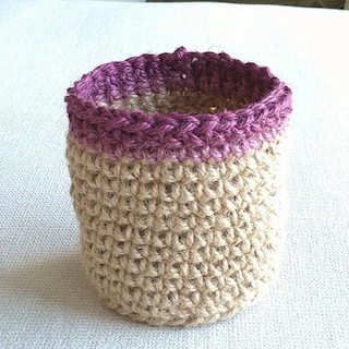編み方は全てこま編みで、縁に濃いピンクと薄いピンクの麻ひもでグラデーションをつけました。