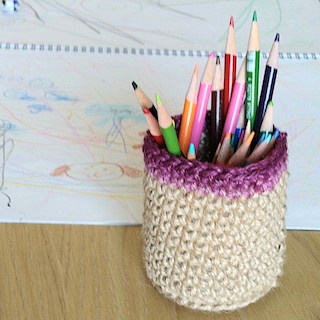 色鉛筆を収納するものがあったらいいなと思って編んだのが、麻ひものペン立て。