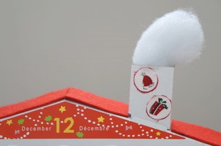 煙突にはプレゼントとサンタさんの帽子のモチーフ柄を貼り、綿を少し覗かせて煙に見立てました。
