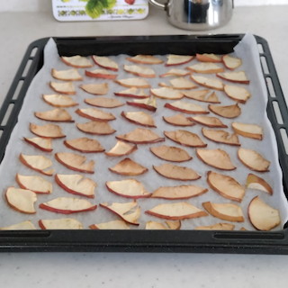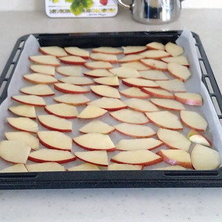 - 天板にクッキングシートを敷いて、水気を切ったりんごを重ならないように並べる。