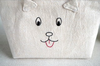 本体前側に犬の目、鼻、口、舌を刺しゅう、三角の耳を縫い付けました。