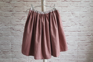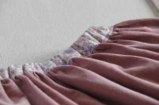 ピンクの細畝コーデュロイに、ウエストの部分だけ花柄の生地を合わせました。
