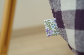 サイドには、紫系の小花柄の布を小さく折りたたんで作ったタブをはさみました。