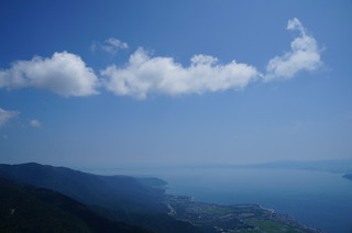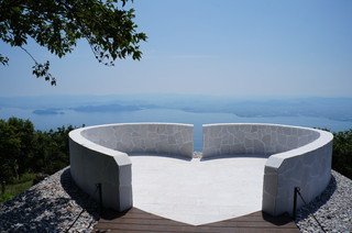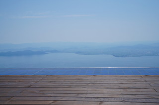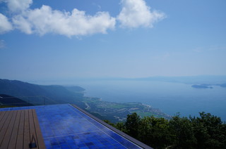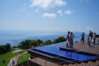 びわこ湖テラスにやってきました。 頂上は26度で、下界は30度でしたから、気温差も大きく、風も心地よいです。 そして、このテラスは最高です。青い空、白い雲、そして、青くて大きな琵琶湖。その眺めは絶景!! テラスの縁は、水のプールになっており、琵琶湖と一体で、なんだか不思議な風景です。 |