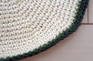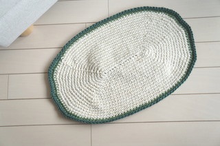 横45cm×縦25cmくらいの楕円形に編み、周りを濃いグリーンと薄いグリーンの麻ひもで編んで