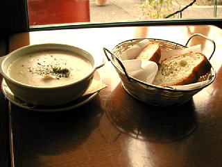 友達が注文したマッシュルームとチキンのクリームスープ・パンつき(¥580) です。ダイエット中なの?と尋ねてしまったのですが見た目よりすっとおなかがいっぱいになるのだそうです。(友達は何度も来たことがあるらしいです)