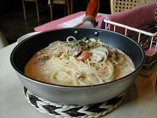 温かいパスタはこんなふうにフライパンごと出てきます。豪快でしょ? |
