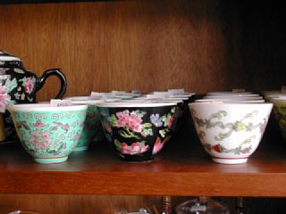 お料理を待っている間に撮った写真。店内にはカラフルな茶器がずらりと並んでいます。