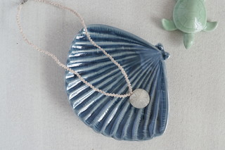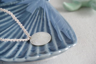 新しい革のコードにシェルをつけようかと思いましたが、ふと思い立って、極細のコットンコード2本で「左右結び」という結びをしてコードを作り、それにシェルを付けてみました。