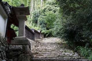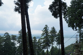 | 808段の石段のスタートです、家族4人で20分ほどでした。しかし、かなり厳しい・・・。境内からは琵琶湖が望めます。しかし、この日はあいにくの雨模様、というか、豪雨でした。残念! | |