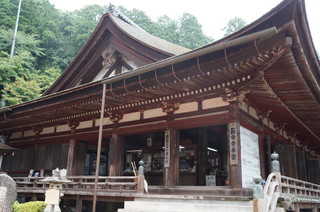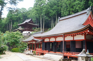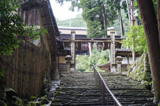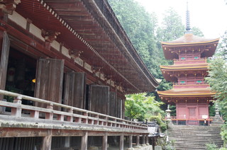 | 本堂(重要文化財)は、寺の文書から室町時代・大永4年(1524年)の建立と判明とのこと。 | 三重塔(重要文化財)は高欄擬宝珠銘から慶長2年(1597年)の建立とのこと。豪雨のあとで、本堂からの雨雫が幻想的で良かったです。 |