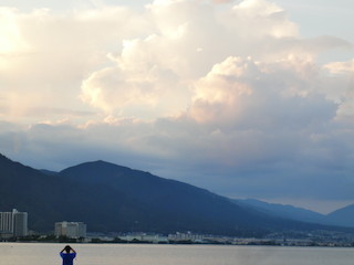 お店から見た景色。琵琶湖がゆっくり暮れていくのを見ながらの食事はいつもと違った優雅な気持ちにさせてくれます。私が撮った写真の左下のほうに、私と同じく夕暮れをカメラに収める人の姿が・・・。 |
