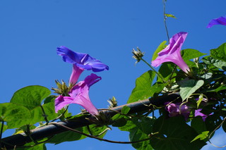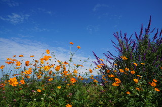 | 4.2haに、20品種800万本のコスモスです、見ごたえあります。 また、沖縄朝顔が咲いていました、ほんとに鮮やかな色しています、この時期に咲いてるんですね・・。 |