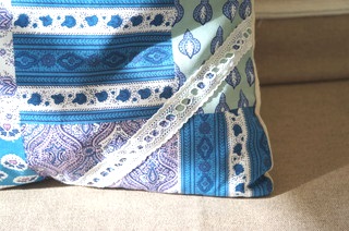 クッション前面にソレイアードの白の布を組み合わせて使い、ソレイアードの部分に幅のあるレースをあしらってワンポイントにしました。(このレースもキットについていました。)