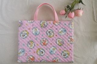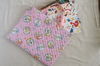 絵本バッグは、丈夫なキルティング布を使用しました。内側には小さなポケットをつけて、図書館カードやハンカチなどを入れられるようにしました。