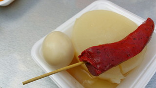 | これは、総門までの参道入り口での露店で出されていた、名物の永源寺こんにゃくを使ったおでん。美味しく頂きました。他にもちくわや牛すじ、白こんにゃくもありました。牛すじは200円、そのほかの具は全て100円です。 |