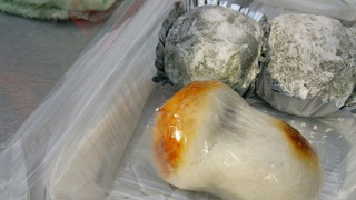 これも、数軒が並ぶ露店で、美味しそうな草餅と饅頭を見つけましたので頂きました。本当にやわらかくて美味しかった。! (ひとり写真を撮る前にフライングした人がいるので3つしかないですが本当は家族4人分あったんです) |