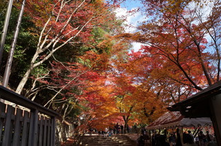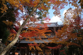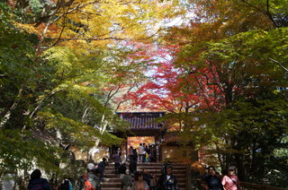 | 総門を潜ると受付があり入山料500円/大人を支払い境内へ。紅葉のトンネルが続きます。 | そして見えてきたのが、山門です。この山門をぬけると本堂が見えます。 |