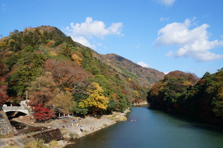| 旦度橋から眺めた永源寺のある山麓と愛知川の風景。色付いた山々と空の青さが本当に綺麗です。 | 旦度橋を渡り、参道の羅漢坂を登ると見えるのが総門。紅葉に囲まれた総門は本当に美しい。 |