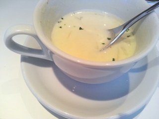 初めに本日のスープ クラムチャウダーをいただきました。クリーミーだけどあっさりしていておいしかったです。(健康診断の後だったのでちょっとバリウムを思い出したりして・笑) |