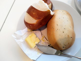 はらぺこだった私たちは「パンお替り自由\315」を注文しようと思ったのですが、「先着30名様にはパンをおふたつ無料でプレゼントしておりますので・・・」とお店の方に言っていただきました。そのパンをいただいてからお腹と相談してお替り自由を注文するかどうか決めることに。