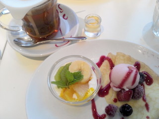 デザートのプレート。アイスの乗ったクレープとミルクプリン。ドリンクはローズヒップティーをいただきました。ここまでいただいてなんと609キロカロリーだそう。メニューにそう書いてありました。「え?ほんまに?」と目を疑いましたが・・・。こんなに満足な609キロカロリーなら毎日でも食べたいなぁと思いました。 |