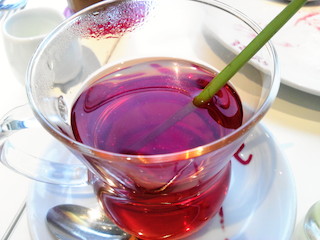 ローズヒップティーはこんなにきれいな色。緑の細長い葉っぱがついていて、ナチュラルな演出もニクイですね〜♪