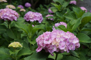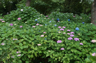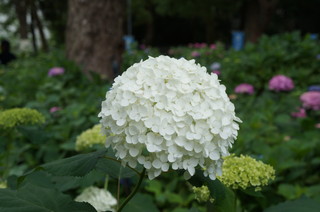 | この日の目的の紫陽花。こちらには、第一紫陽花苑と第二紫陽花苑があり、3500株の紫陽花があるとのことです。 | こんなハート形の紫陽花もありました。藤森神社では人もそんなに多くなく、穴場かもしれません。 |