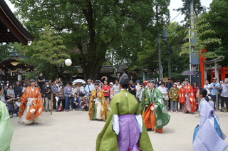 | 13:00からは、蹴鞠(けまり)奉納(京都蹴鞠保存会)がありました。蹴鞠をこんな近くで見ることができるとは、ラッキーでした。 蹴鞠をライブで見るのは初めてでよい機会に恵まれました。 |