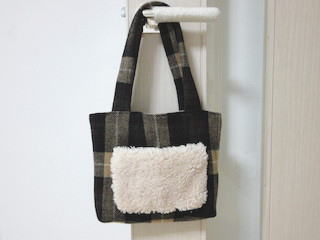 できたのがトートバッグ。プードルファーを使って大きなポケットをつけました。画像ではわかりにくですが