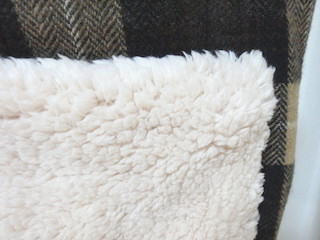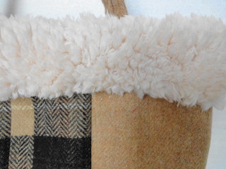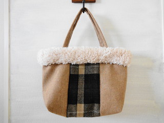 両サイドにはキャメルのツイードっぽい布を、入れ口にはプードルファーをあしらって。