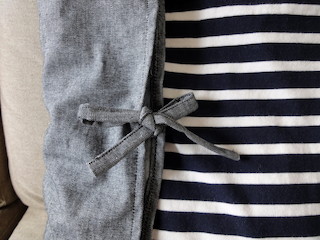 ストライプとイカリマークの布で作ったポケットを少しずらして付けました。ポケットと言っても何も