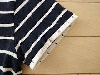 もうひとつは、ネイビーとホワイトのボーダーTシャツの袖にイカリマークのバイアステープをつけ