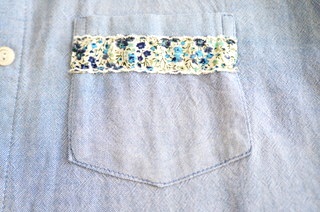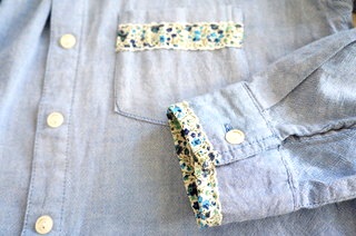 そこで、先日手芸用品店で見つけたリバティのレーステープを使って、ダンガリーシャツに少しデコレーションしてみました。