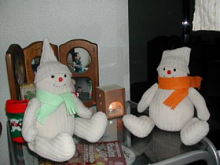 帽子の形を変えて、マフラ−の色や巻き方も変えて二人の違った表情のスノ−マンにしました。春になったらマフラ−をスカ−フに変えてあげても楽しめそう。 |