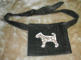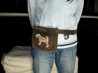 子供用のウエストポ−チにしました。ポケットのついてないスカ−トやパンツでもこのウエストポ−チがあればハンカチはなかみも携帯できます。ポイントにわんちゃんのシルエットをかたどったフエルトアップリケをつけました。ウエストのペルトにはバックルをつけたので調節可能です。 |