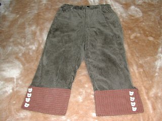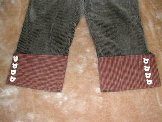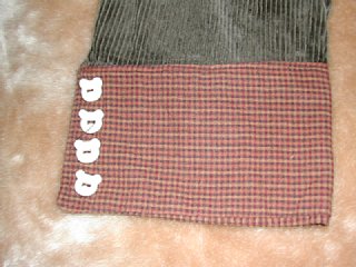 130cm用コ−デュロイのストレ−トパンツの裾をカットし、チェックの布をプラスしました。ポイントにくまさんの形のボタンを並べて