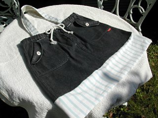 次女が履けなくなったデニムスカートと私の着古したボーダーTシャツを組み合わせてバッグを作りました。スカートのひも