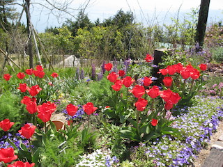 | 琵琶湖が一望できます。本当に気持ちのいい風に、美しい風景にと、心 癒されます。 | GWでの、庭園の主役はやはりチューリップ。 |
