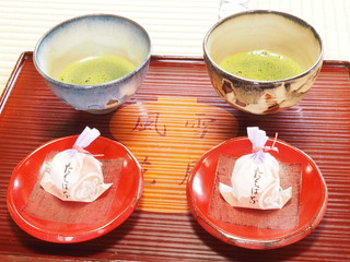 茶室でお茶を頂きました。 お茶菓子は、井伊家の家紋とされる”たちばな”というお菓子 |