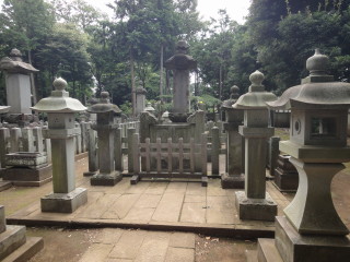 | 井伊家の墓所には、豪徳寺中興の祖とも云える二代直孝を始めとして、六代直恒、九代直=A十代直幸、十三代直弼、そして彦根藩最後の藩主である十四代直憲が葬られています。更に正室・側室・早世した家族、江戸で亡くなった藩士なども葬られており、三百余基の墓石がある広大な墓所となっていて、墓所全体が国指定史跡となっています。 左は、十三代井伊直弼のお墓です。 |