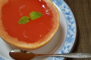 グレープフルーツの果汁を絞って、お湯で溶かしたゼラチンとお砂糖を加え、グレープフルーツの皮に注ぎ込み冷蔵庫で冷やします。
