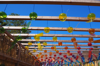 風鈴の小道を通って、高島チジミによる虹のカーテンの奥には、広大な琵琶湖が眺められます!天気に恵まれ、青さが際立っています。 |
