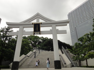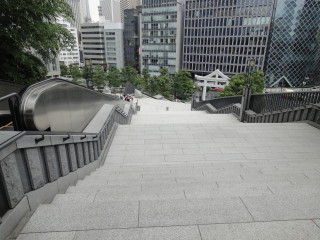 | 都会のど真ん中にある神社らしい近代的な大鳥居 | この石段にはエスカレーターも設置されています。 |
