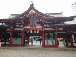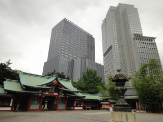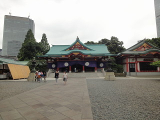 | 参道から上がったところの神門 | 本堂が見えます。永田町にある神社としては広い境内です。 |