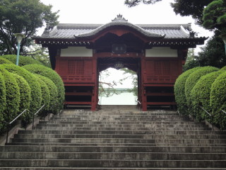 | 不老門は、京都の鞍馬寺の門を基本に設計された。昭和13年。 | 本堂。1697年建立。元禄時代の建築工芸の粋を結集した大建造物で、その雄大さは都内随一のものと賞されている。震災、戦火をのがれ、今も残る貴重な建物である。 |