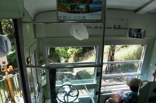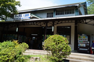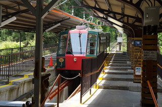 | 叡山ケーブは、ロープウェイ駅のすぐ目の前です。 | そして、いよいよ叡山八瀬へ降ります。これが無茶苦茶急勾配なんです。坂本ケーブルよりも急ですね。 |